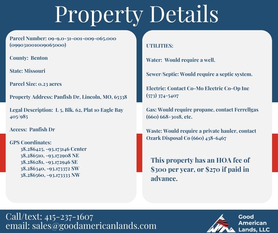 Disclaimer Buyer must perform their own due diligence they should do with any land purchase. This land is sold as is and all information provided is to the best of sellers knowledge. Seller does not guarantee accuracy of property location on maps or descriptions show in listing as well as facts describing the property. Buyer to verify all details of property including property location and boundaries and lot lines, as well as feasibility to use property for buyers desired purpose. Many of the pictures provided are not personally taken by the seller and some of the presented pictures represent the general area near/around the property. All utilities related to this property are potentially subject to a connection charge or additional expense to bring them to or onto the property. Furthermore, It is understood and agreed to by the parties involved that selling party, while holding an equitable interest in and to the property, is not presently making, and has not made, any representation to any party that it holds legal title in and to the property. To the fullest extent permitted by law, the Buyer hereby agrees to waive, release and forever discharge goodlanddiscounts.com, goodamericanlands.com, Good American Lands, LLC and all its affiliate companies from any claim, be it at law or in equity, that the Buyer, their heirs, transferees, assigns, subrogees, devisees, and agents may allege, arising out of our disclosure(s) of its present interest in and to the property, if any as well as out of any potential and accidental discrepancies in lot lines, pictures or property location to the actual property